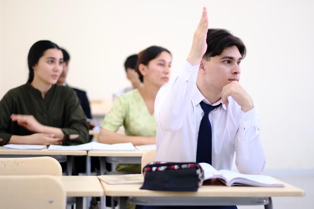 6月12日,在塔吉克斯坦首都杜尚别,学生在塔吉克斯坦民族大学孔子学院课堂听课。