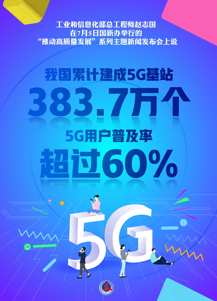 新华社北京7月5日电(记者张辛欣、王悦阳)工业和信息化部总工程师赵志国在5日国新办举行的“推动高质量发展”系列主题新闻发布会上说,我国累计建成5G基站383.7万个,5G用户普及率超过60%。
