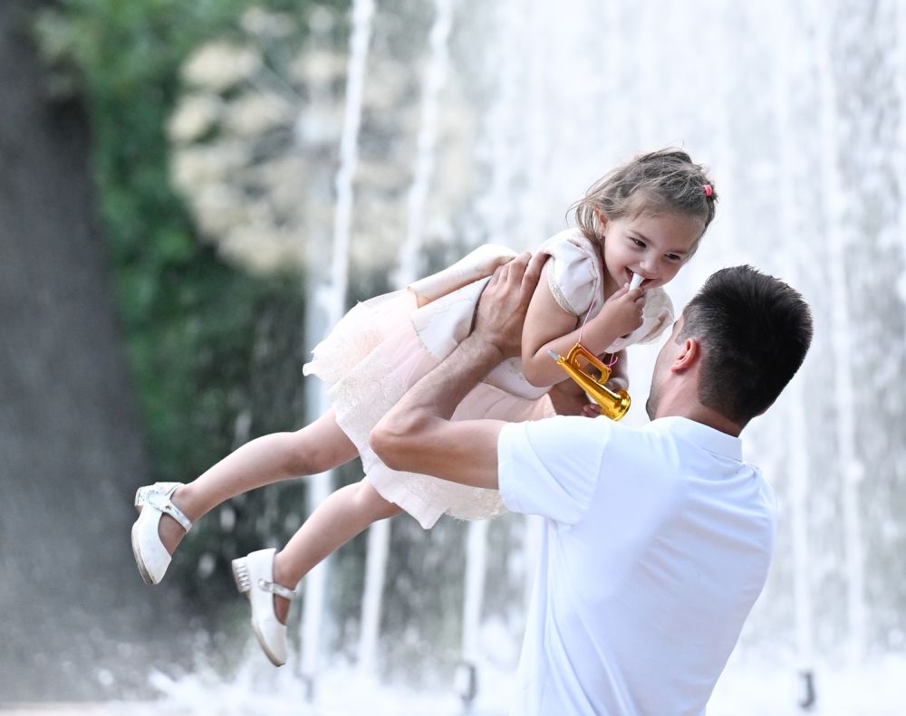 ↑一名男子在杜尚别的鲁达基公园内与孩子玩耍。 新华社记者 申宏 摄