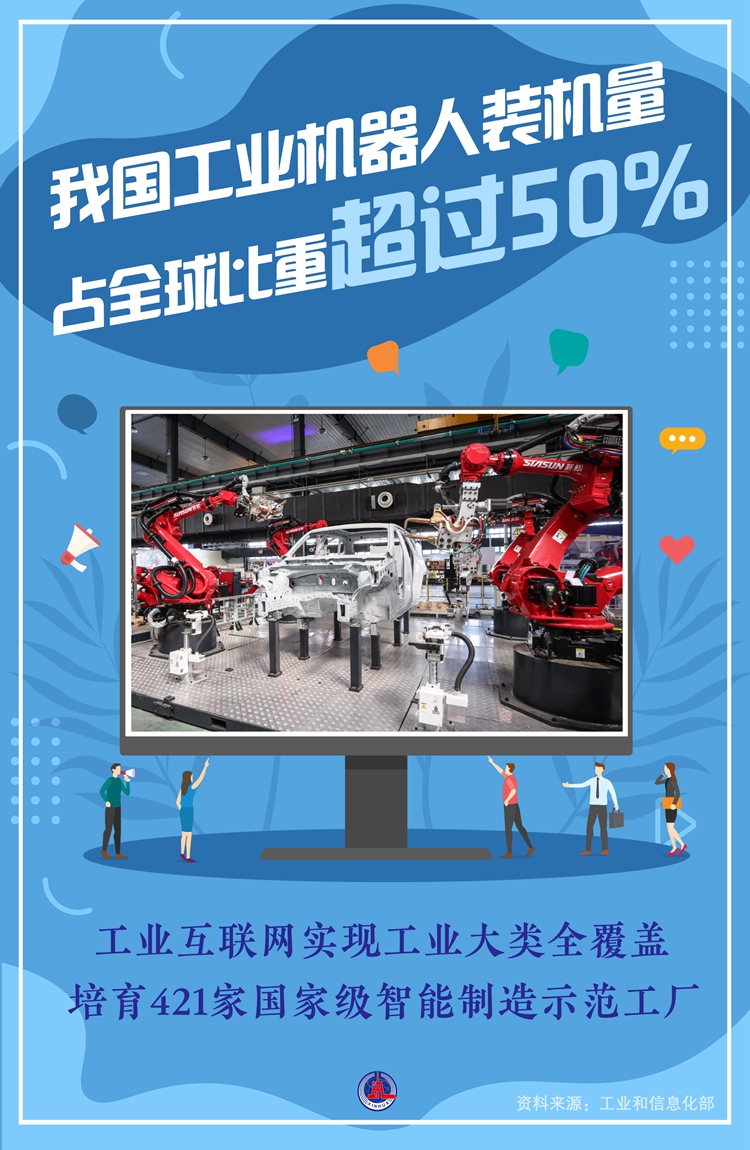 新华社北京7月5日电(记者张辛欣、王悦阳)工业和信息化部副部长辛国斌在5日国新办举行的“推动高质量发展”系列主题新闻发布会上说,目前,我国工业机器人装机量占全球比重超过50%,工业互联网实现工业大类全覆盖,培育421家国家级智能制造示范工厂。