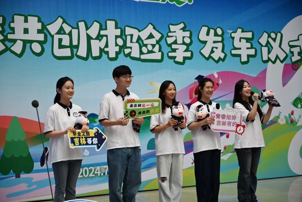 7月3日,“青春续‘吉’伴夏出发”大学生文旅共创体验季发车仪式上,高校体验团队进行风采展示。新华社记者宋心平 摄