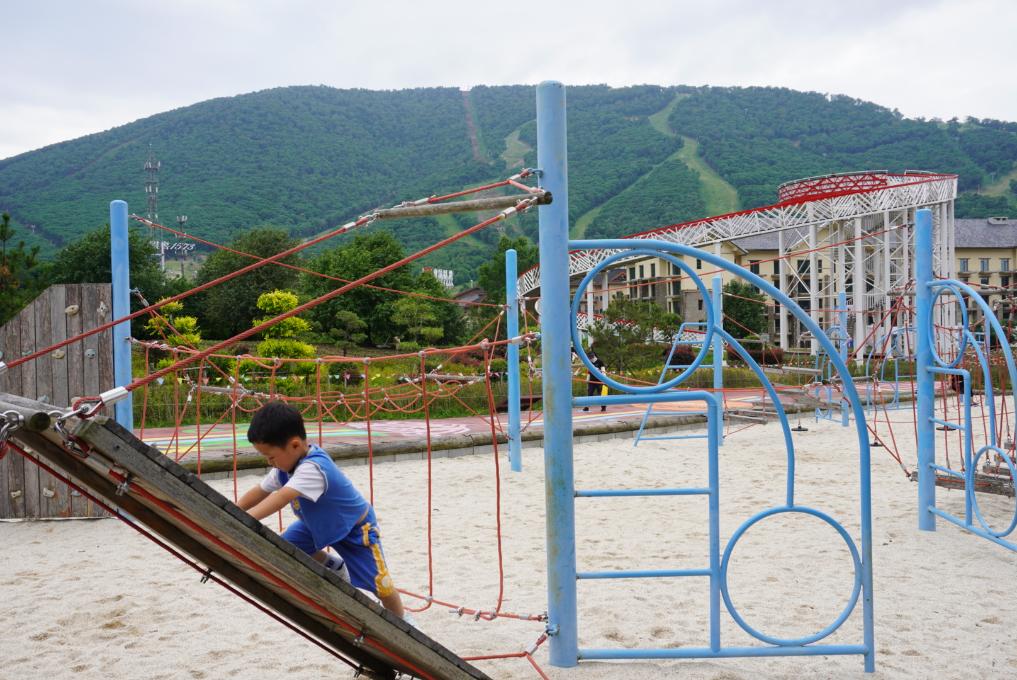 7月7日,一名游客在北大湖滑雪度假区内进行素质拓展训练。新华社记者 李典 摄