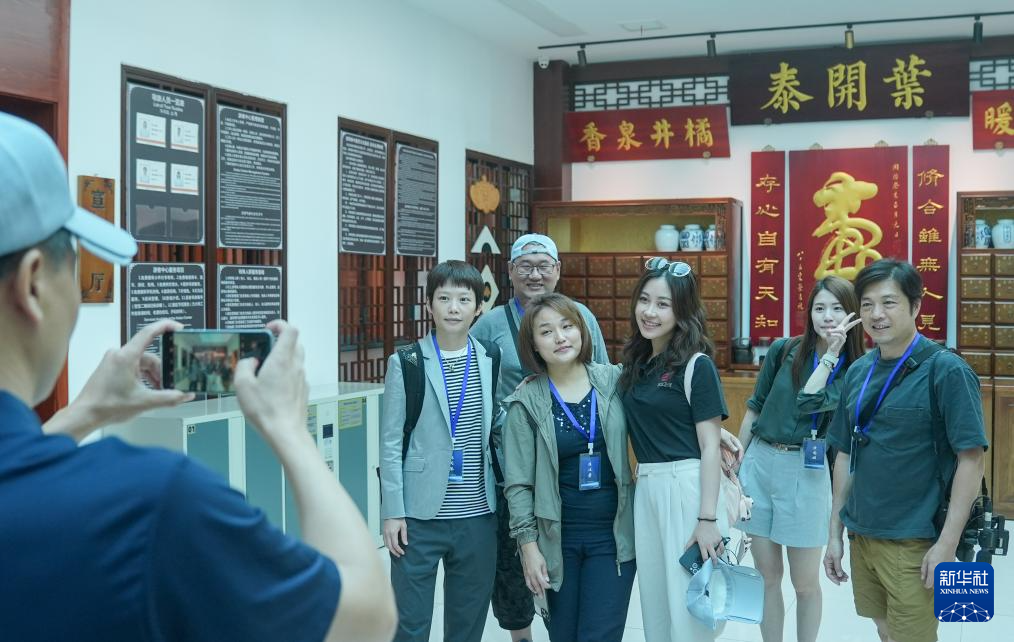 7月5日,在湖北省武汉市叶开泰中医药文化园,“海峡两岸媒体荆楚行”参访团成员合影留念。新华社记者 杜子璇 摄
