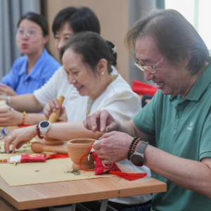 7月5日,在湖北省武汉市叶开泰中医药文化园,“海峡两岸媒体荆楚行”参访团成员体验制作香包。新华社记者 杜子璇 摄
