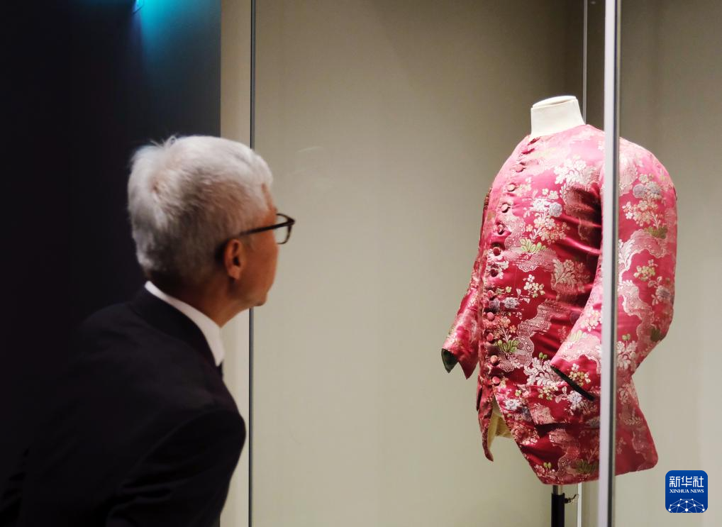 香港故宫文化博物馆馆长吴志华在仔细观看一件图案纹饰带有“中国风”的18世纪法国男性贵族穿着的红色半长外套(6月25日摄)。 新华社记者 王申 摄