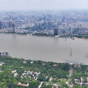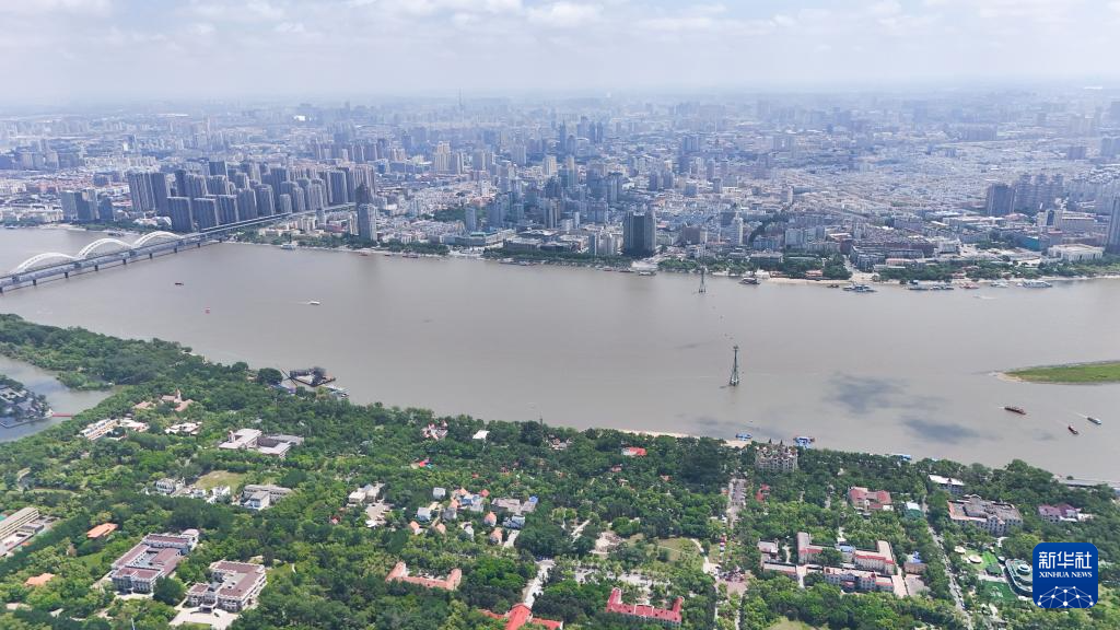这是6月4日拍摄的哈尔滨市松花江北岸的太阳岛国家湿地公园局部景色与对岸的局部城市景观(无人机照片)。新华社记者 王松 摄