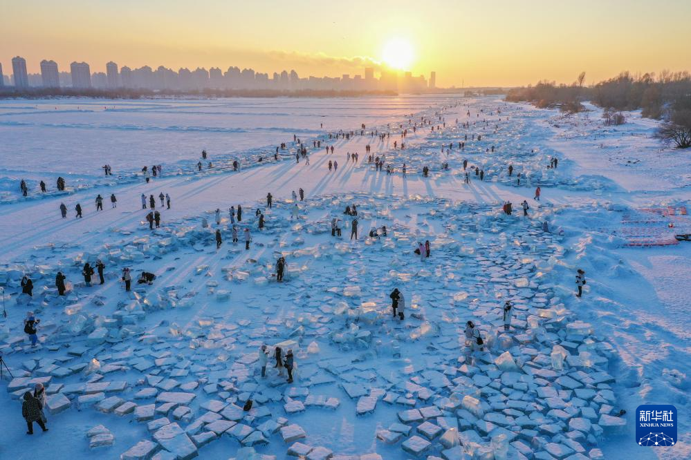 在封冻的松花江哈尔滨段,游客在日落时分的“钻石海”游玩(无人机照片,1月7日摄)。新华社记者 谢剑飞 摄