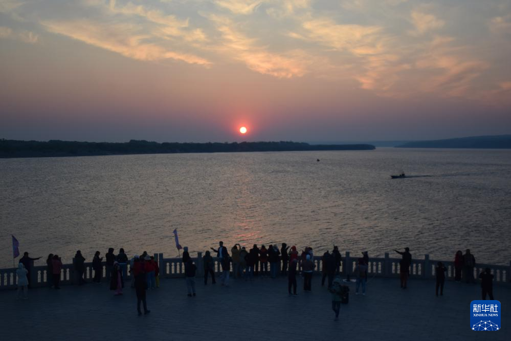 游客在“华夏东极”黑龙江抚远观赏日出美景(5月19日摄)。新华社发(官长青摄)