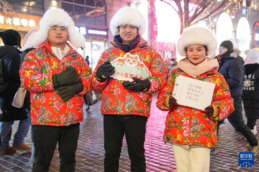在哈尔滨市道里区中央大街,当地人通过东北方言问答送礼品的方式欢迎外地游客(1月3日摄)。新华社记者 谢剑飞 摄