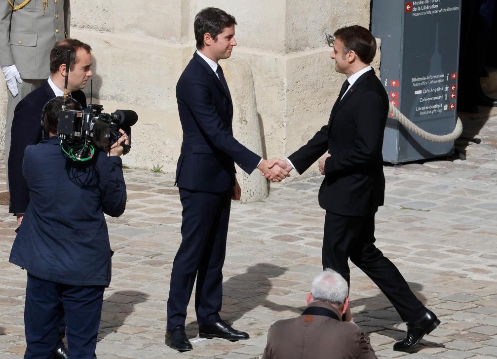 这是2024年3月20日,法国总统马克龙在巴黎与总理阿塔尔握手的资料照片。新华社发(亨利·施瓦茨摄)