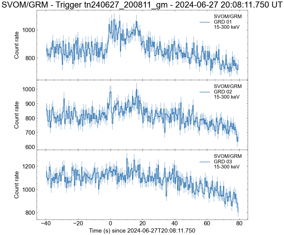 据介绍,由中国科学院高能物理研究所研制的伽马射线监测器于6月24日正式开机,6月27日进行在轨测试,27日当天就探测到首个伽马暴(GRB 240627B)。此后,伽马射线监测器分别于6月29日和7月2日探测到第二个和第三个伽马暴,编号分别为GRB 240629A和GRB 240702A。