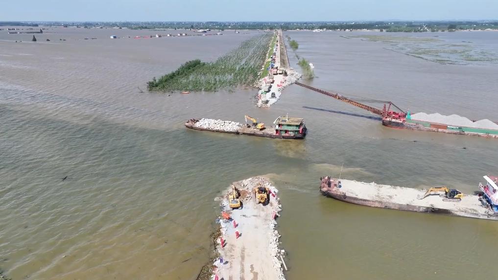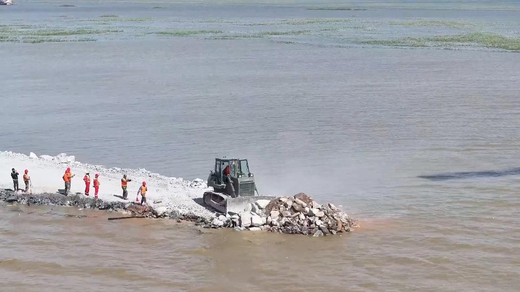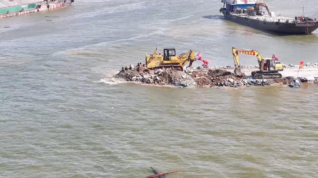 堤上,满载块石、砂卵石等物料的卡车,一趟接一趟地向水中卸料。水上,大型驳船轰鸣而来,将石料一轮轮抛投下。