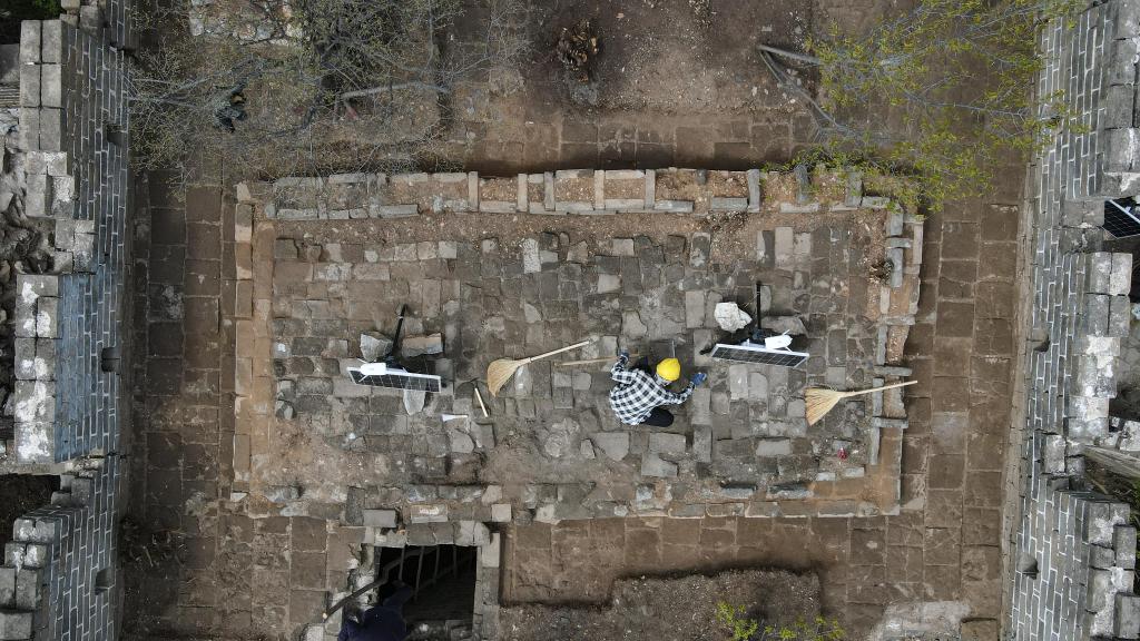 工人在箭扣长城121号敌台顶部进行考古清理(4月30日摄,无人机照片)。目前,该敌台已完成考古,进入修缮施工阶段。新华社记者 陈钟昊 摄