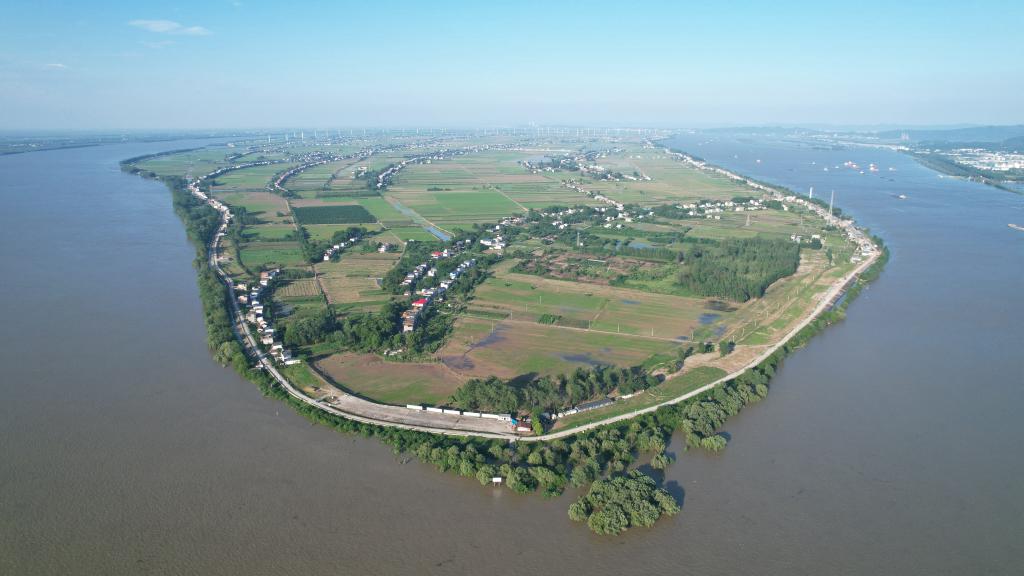 鸟瞰江新洲的护堤。 新华社记者 刘诗平 摄