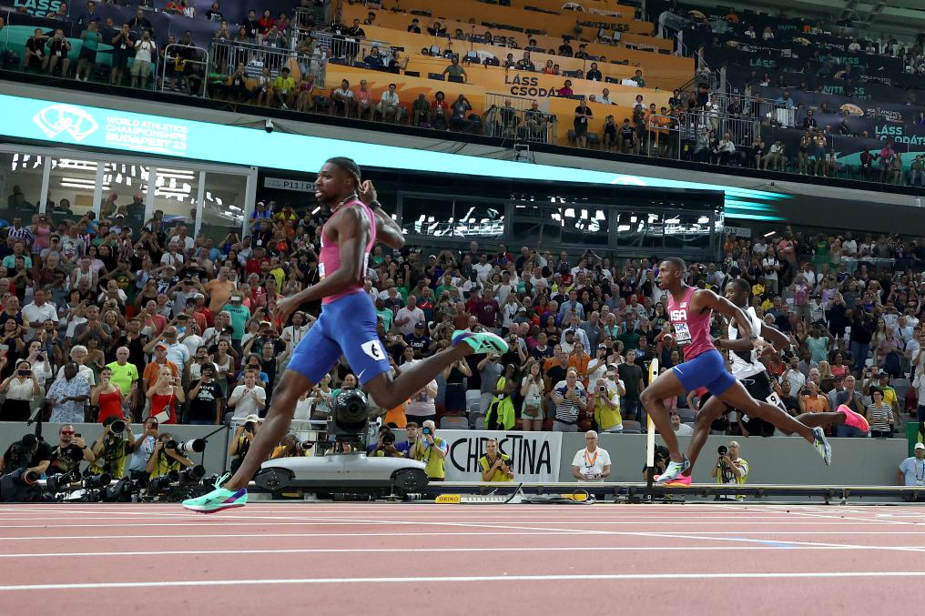 2023年8月25日,莱尔斯(左)在比赛中冲过终点。当日,在匈牙利布达佩斯举行的2023世界田径锦标赛男子200米决赛中,美国选手莱尔斯以19秒52的成绩夺得冠军。新华社记者 李明 摄