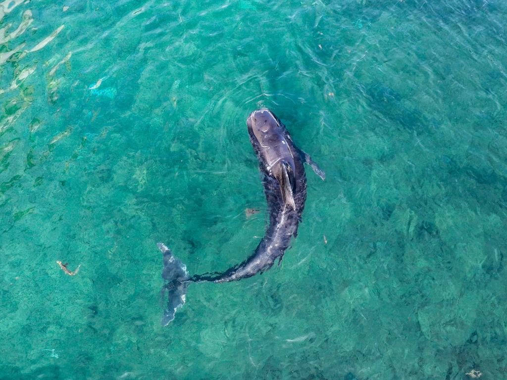 5月26日,短肢领航鲸“海棠”在大海里游动(无人机照片)。