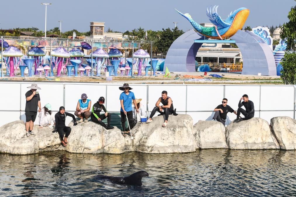 1月21日,三亚海昌生物保育中心的工作人员在水中观察短肢领航鲸“海棠”的状态,以免其发生意外(无人机照片)。