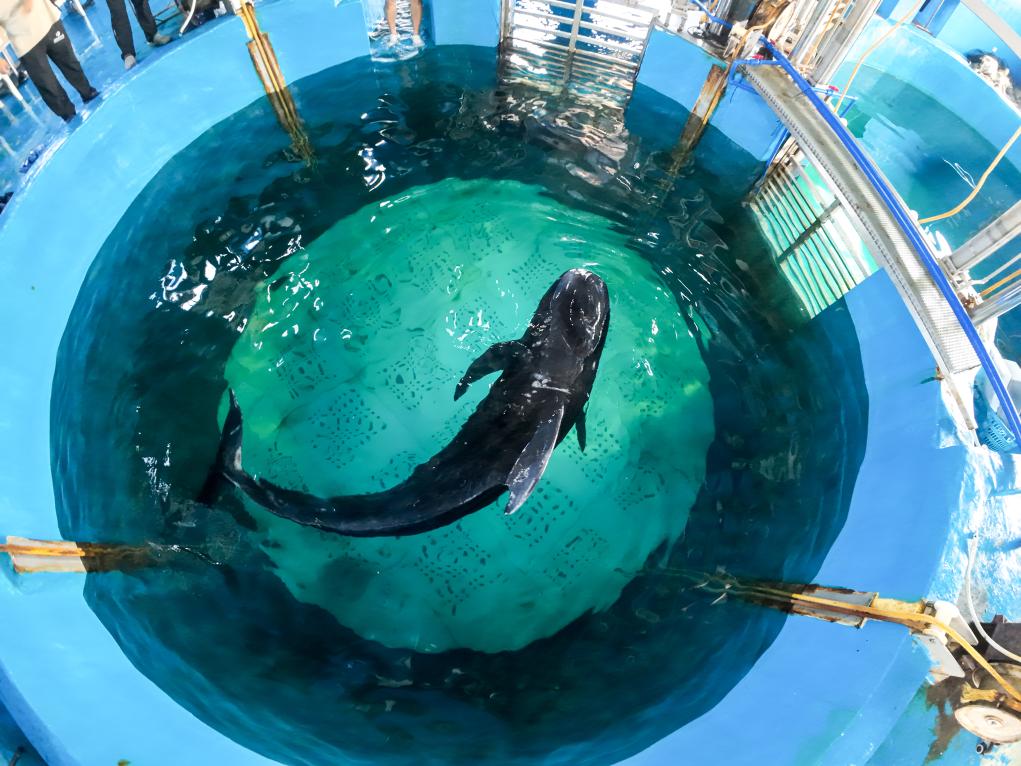 放归要经历好几个阶段,挑战重重——潜水员拉网把它从室外赶到室内并转移到担架上,再由卡车将它吊到特制的水箱里,最后转运到船上。