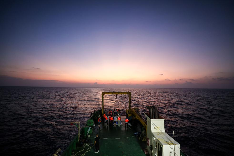 凌晨2点,海面一片漆黑,只有“利洋358”科考船后甲板的灯光照着海面。
