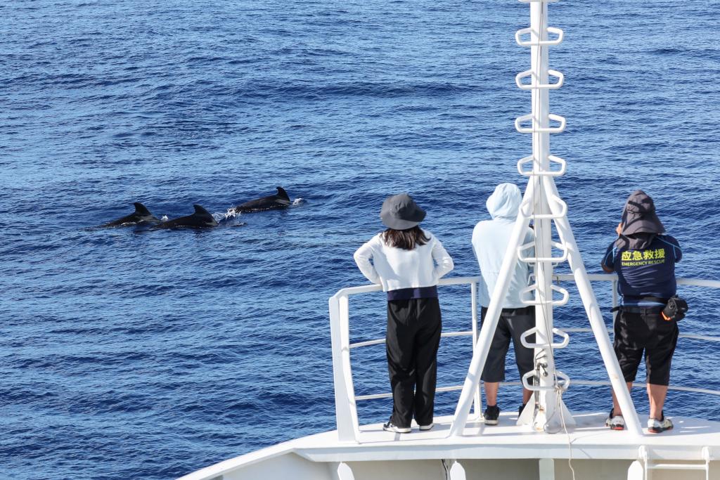 5月25日,在“利洋358”科考船上,志愿者在观察短肢领航鲸“海棠”的状态。