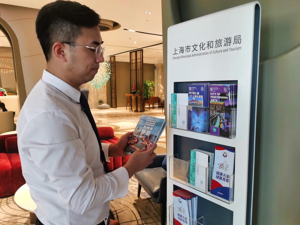 7月7日,李伟在酒店公共区域补充一批公益地图、城市旅游导览手册,这些资料深受入境游客欢迎。新华社记者 陈爱平 摄