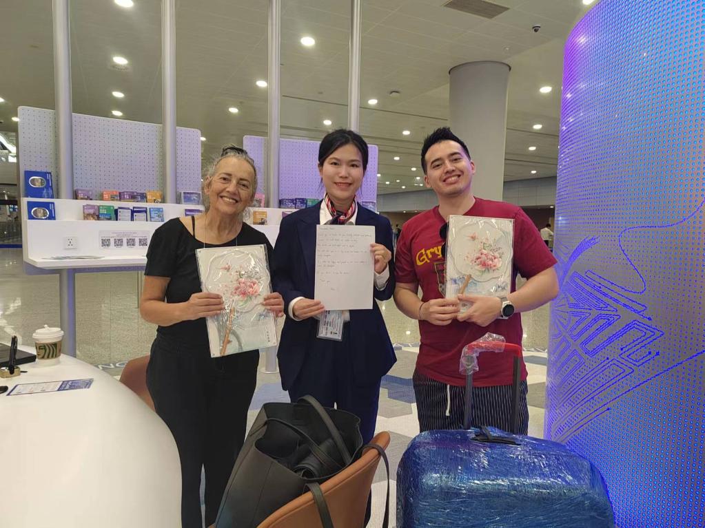 上海浦东机场T2航站楼的外籍人员一站式综合服务中心近日建成投用,按照支付、文旅、通信、交通四个模块功能,为外籍人员提供便利化服务。南非游客艾利克斯在此办理短期通信卡后写下留言:“中国让入境游客体验到更多便利,这让我们非常开心。上海电信的工作人员还送上两把中国扇子用以缓解暑热。”