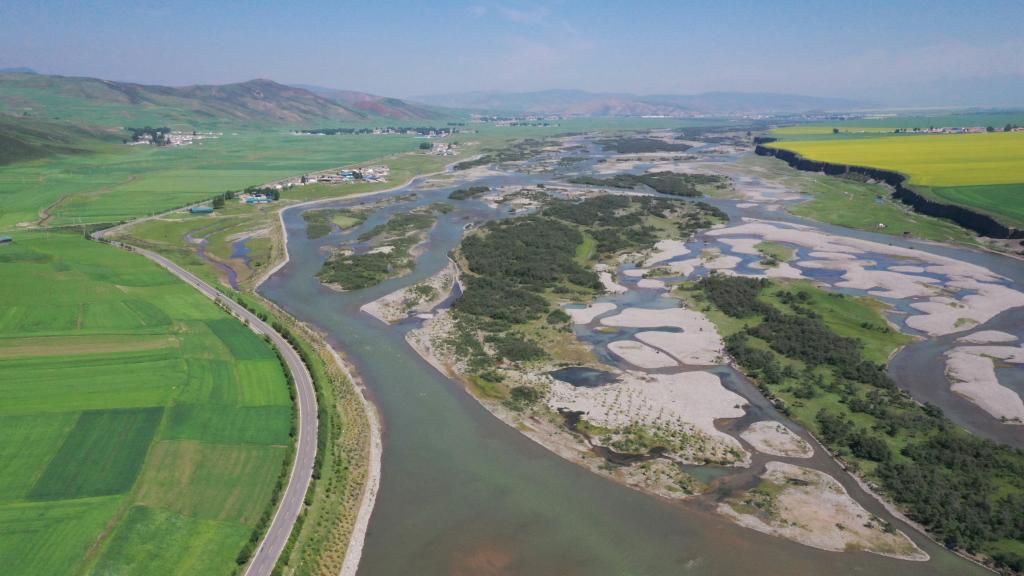 这是2022年6月24日拍摄的祁连山下的大通河(无人机照片)。新华社记者 李占轶 摄
