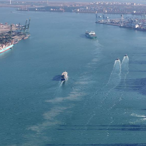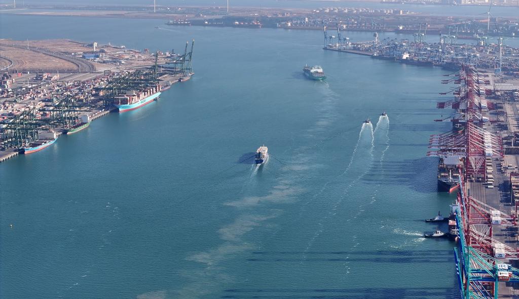 3月20日,货轮行驶在天津港北航道内(无人机照片)。新华社记者 赵子硕 摄