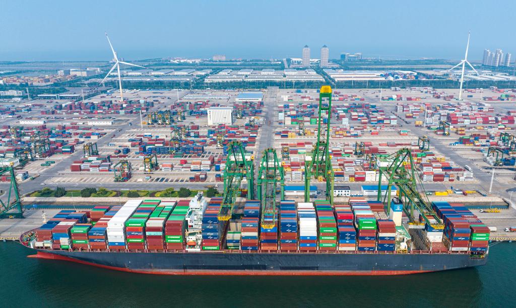 7月3日,一艘集装箱货轮停靠在天津港太平洋国际集装箱码头(无人机照片)。新华社记者 赵子硕 摄