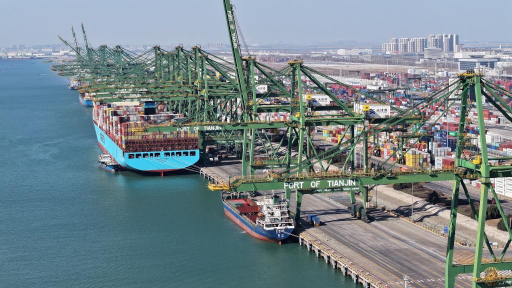 3月20日,货轮靠泊在天津港北航道内的泊位中(无人机照片)。新华社记者 赵子硕 摄