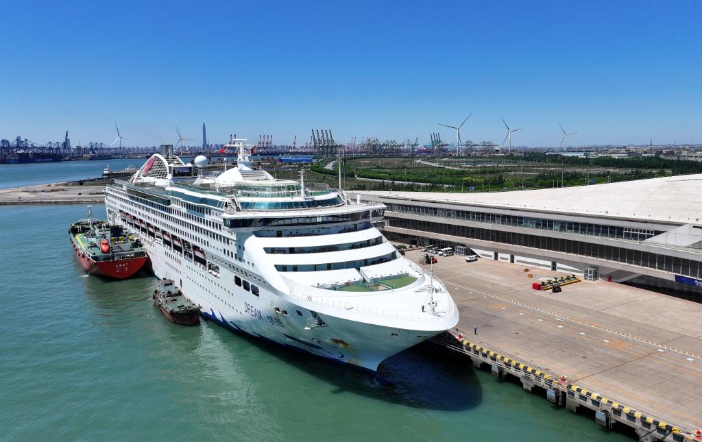 5月15日,“梦想”号邮轮停靠在天津国际邮轮母港(无人机照片)。新华社记者 赵子硕 摄