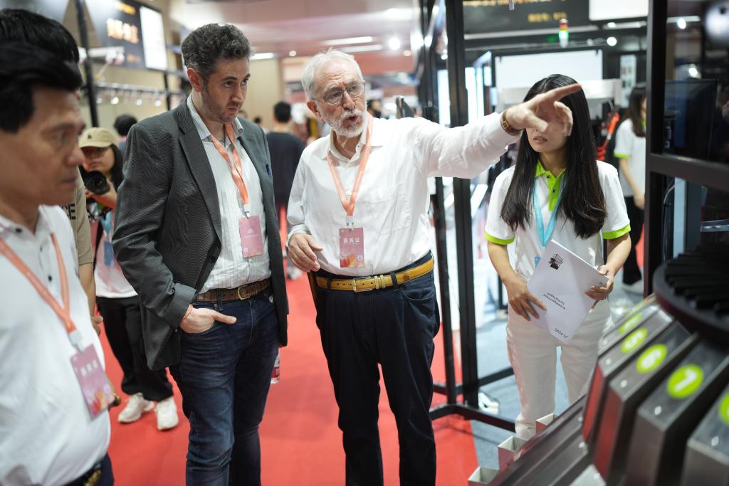 5月20日,两名加拿大籍客商在了解一款国内自主研发的AI珍珠精选机。新华社记者翁忻旸摄