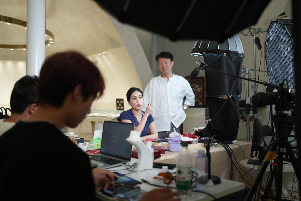 5月20日,在浙江省诸暨市一家珍珠企业的展厅,主播在介绍珍珠饰品。新华社记者翁忻旸摄