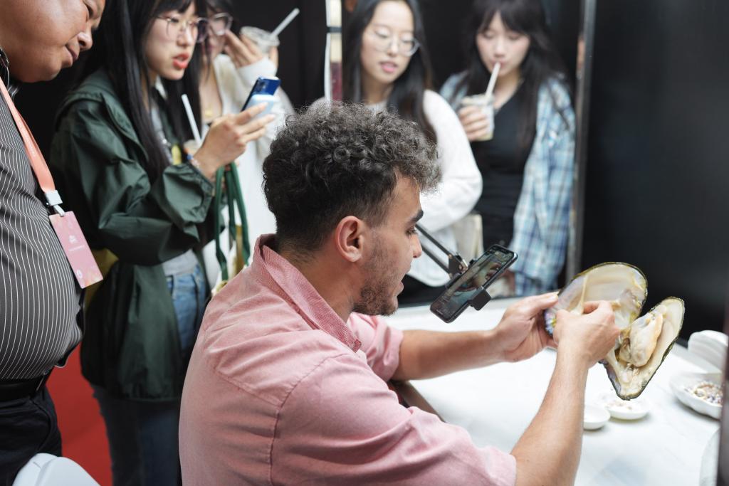 5月20日,一名阿尔及利亚籍的主播在浙江诸暨进行直播开蚌。新华社记者 翁忻旸摄