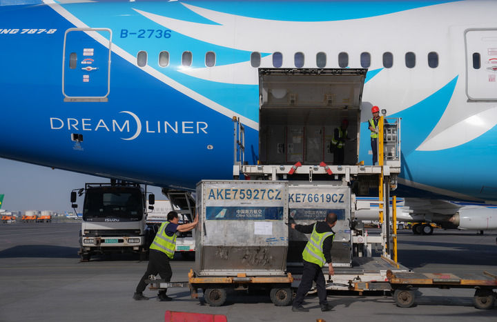 南航工作人员在乌鲁木齐地窝堡国际机场装卸国际航班货物(2024年4月28日摄)。新华社发(车捷 摄)