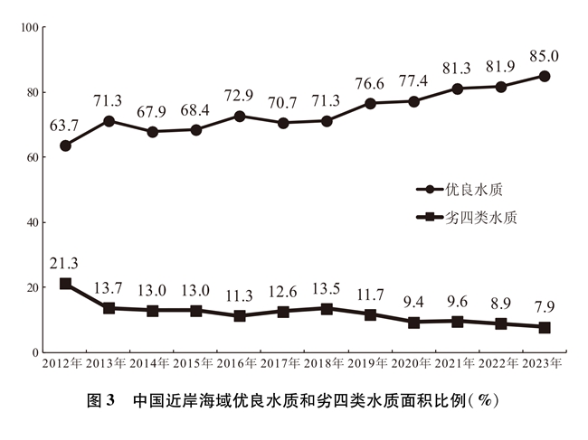 通过深入推进重点海域综合治理、陆海污染协同防治,持续建设美丽海湾,中国近岸海域水质总体改善,2023年优良水质面积比例较2012年高出21.3个百分点。