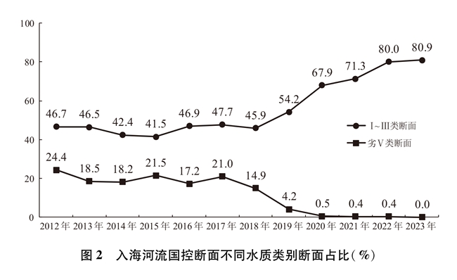 抓好入海河流污染防治。入海河流是陆源污染物输入海洋的最重要途径。中国积极提升城镇污水处理质效,建设改造雨污分流管网,加强污水处理行业监管,降低城镇生产生活污水对入海河流水质影响。2012年以来,沿海地区污水处理基础设施建设显著提速,地级以上城市污水处理厂基本完成一级A提标改造。开展农村环境整治,“十四五”以来,沿海省份新增完成1.7万个行政村环境综合整治,编制完成170个畜牧大县畜禽养殖污染防治规划,农村生活污水治理率超过45%,大幅降低农业农村污水排放。着力破解流域氮排放过量的近岸海域水质污染和富营养化问题,建立沿海、流域、海域协同一体的综合治理体系,探索将总氮控制范围向入海河流上游拓展,推动入海河流实施“一河一策”总氮治理。2012-2017年中国入海河流国控断面水质整体保持稳定并有所好转,2018年以后水质整体大幅好转。目前,入海河流国控断面水质优良(Ⅰ~Ⅲ类)断面数量约占整体的五分之四左右,丧失使用功能(劣Ⅴ类)断面基本消除。