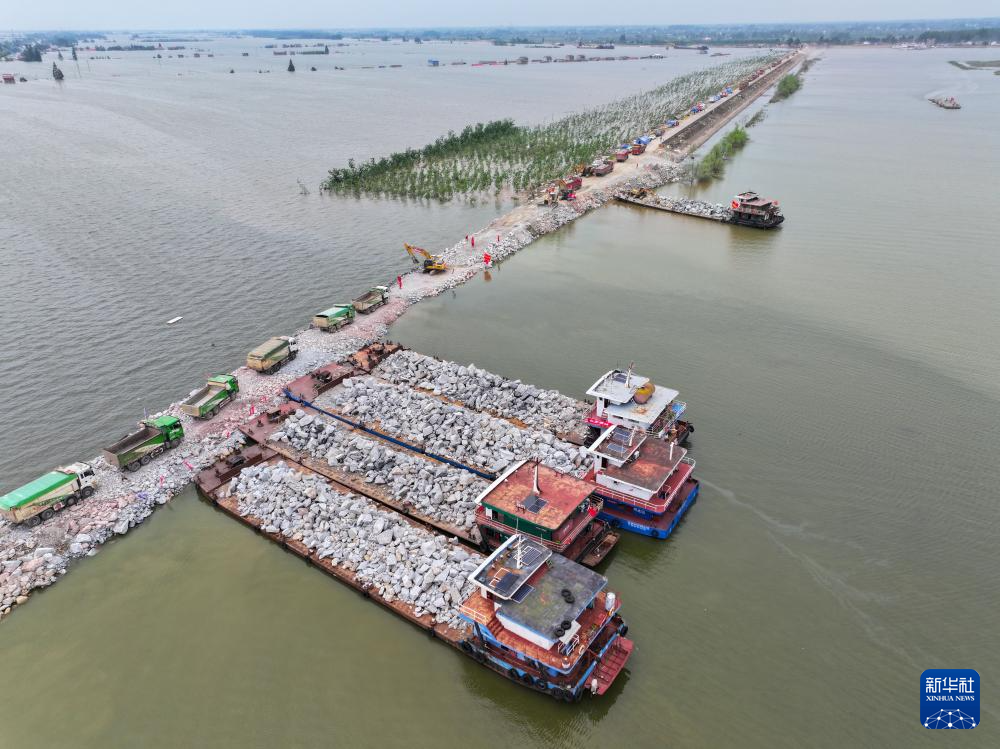 来自周边地区的块石、砂卵石等10余万方物料通过水陆两路紧急进发。堤上,满载石料的卡车排起长龙;水中,湖北等地的运石船破浪而来。