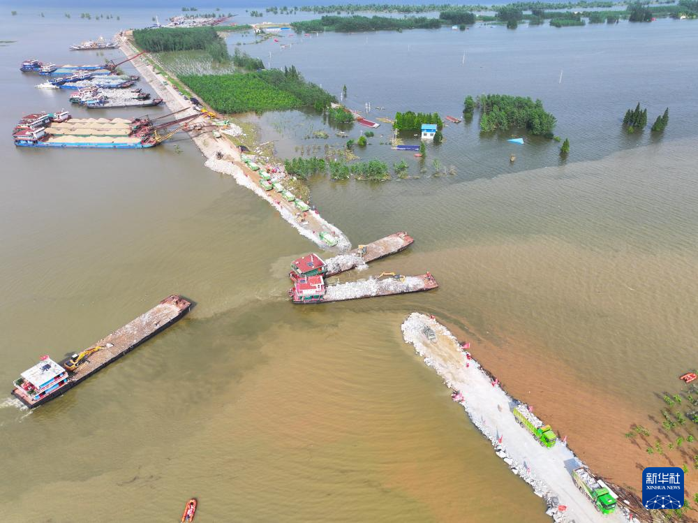 11日,湖南省华容县团洲垸,已经合龙的洞庭湖大堤堵口正在加固。