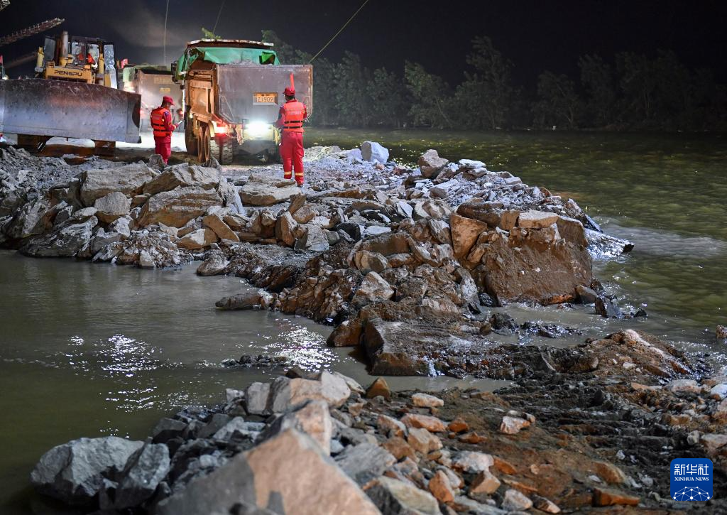 6日,中国安能集团、武警、消防等单位480余人抵达堵口一线,挖掘机、推土机等工程装备从堤坝决口两岸推进,大型驳船在决口中心源源不断抛投石料,“人歇机不歇”。