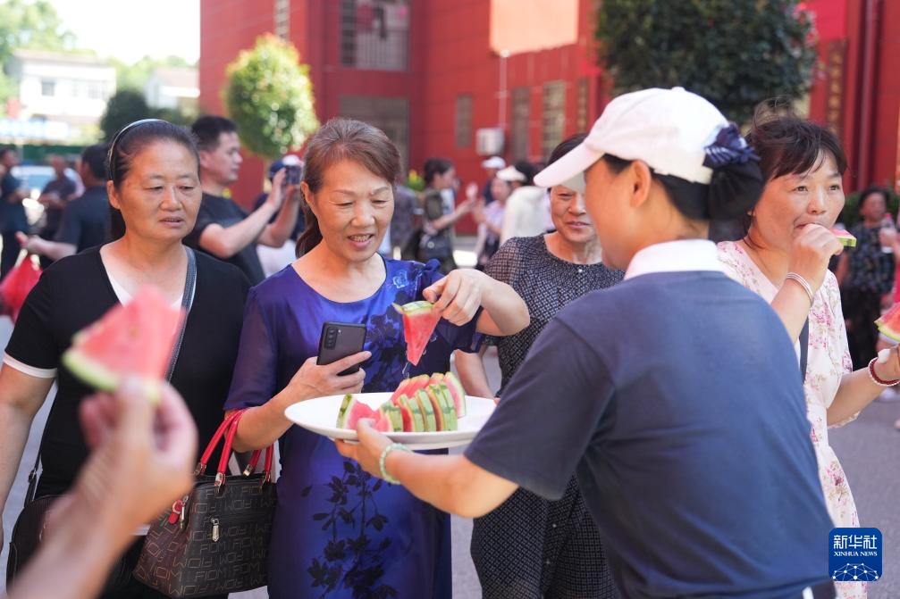 7月7日,转移安置的群众在华容县职业中专安置点吃西瓜。新华社记者 薛宇舸 摄