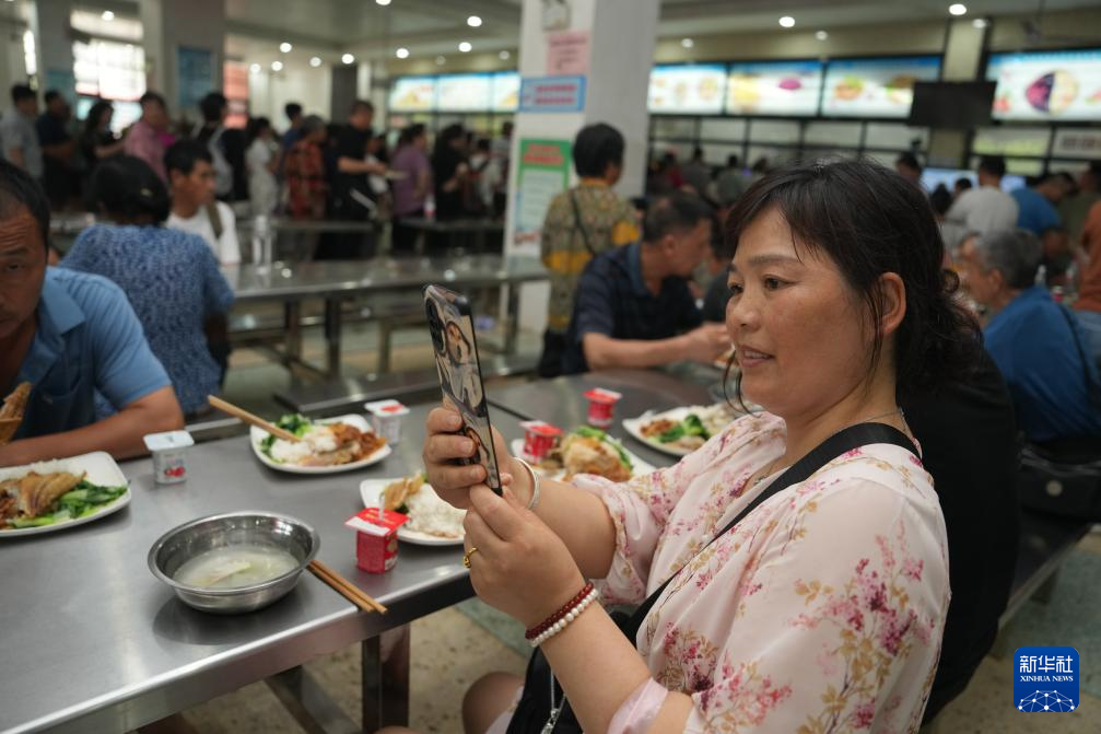 7月7日,转移安置的群众在华容县职业中专安置点吃午餐时拍摄视频发送给家人。新华社记者 薛宇舸 摄