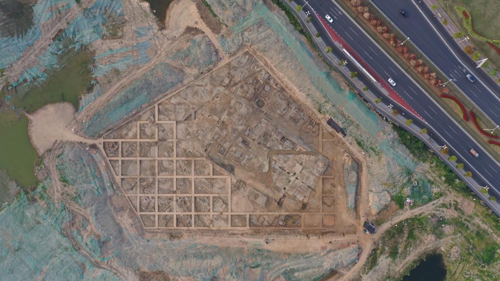 板闸镇遗址发掘区航拍图。(受访单位供图)