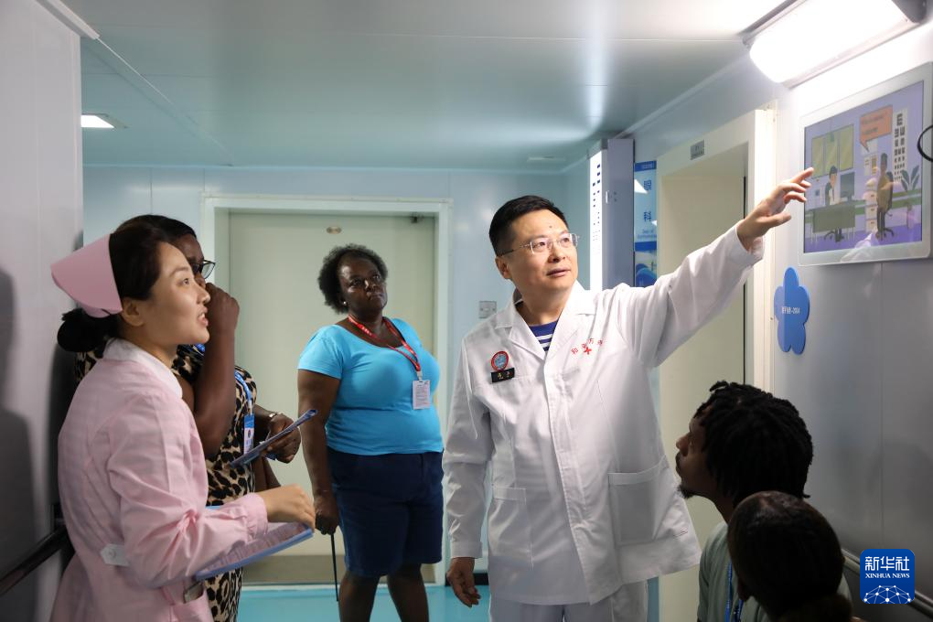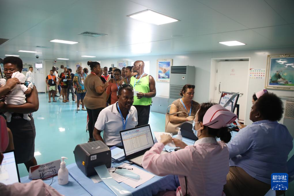7月6日,医务人员在中国海军“和平方舟”号医院船上为塞舌尔民众提供医疗服务。新华社发(刘志磊摄)