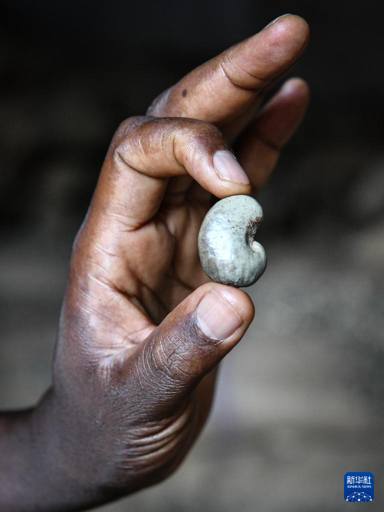 7月7日,在几内亚比绍首都比绍的一处腰果加工厂,工人展示未脱壳的腰果。新华社记者 韩旭 摄