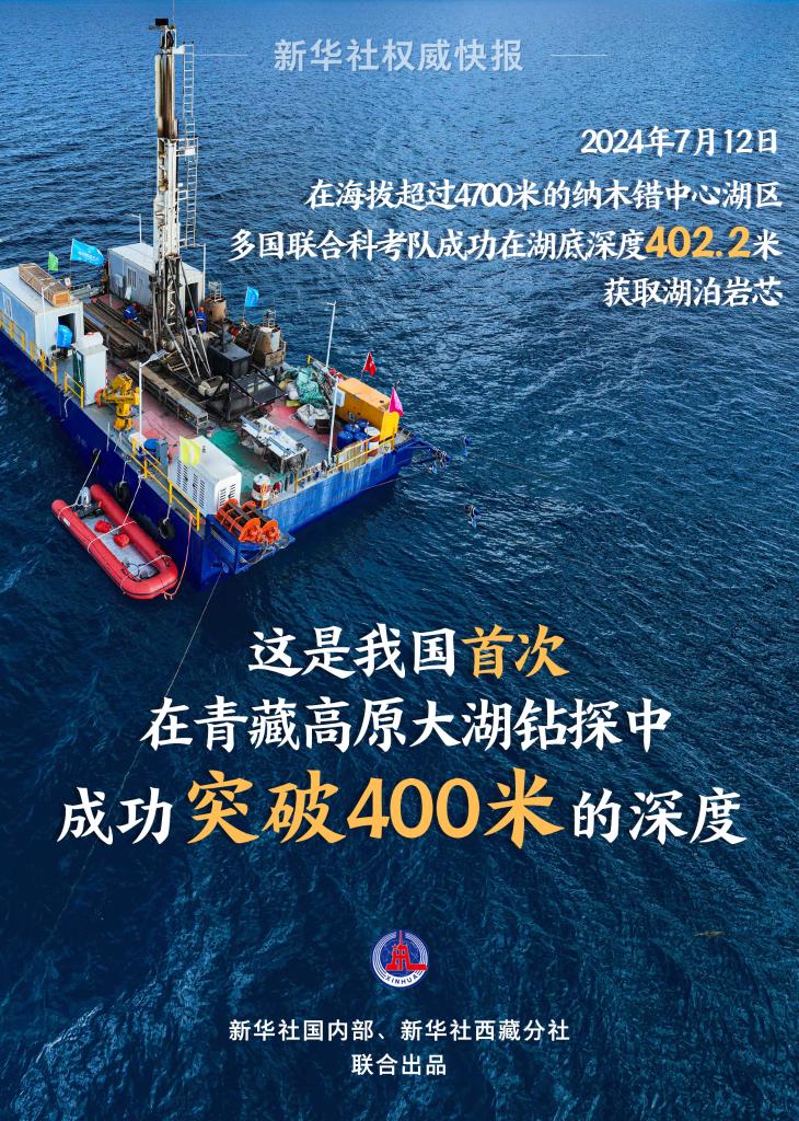 纳木错湖泊科考正在紧密开展。7月12日18时35分,在海拔超过4700米的纳木错中心湖区,多国联合科考队经过不懈努力,成功在湖底深度402.2米的地方获取了湖泊岩芯。这是我国首次在青藏高原大湖钻探中成功突破400米深度,对我国湖泊钻探与古气候的研究具有重要意义。