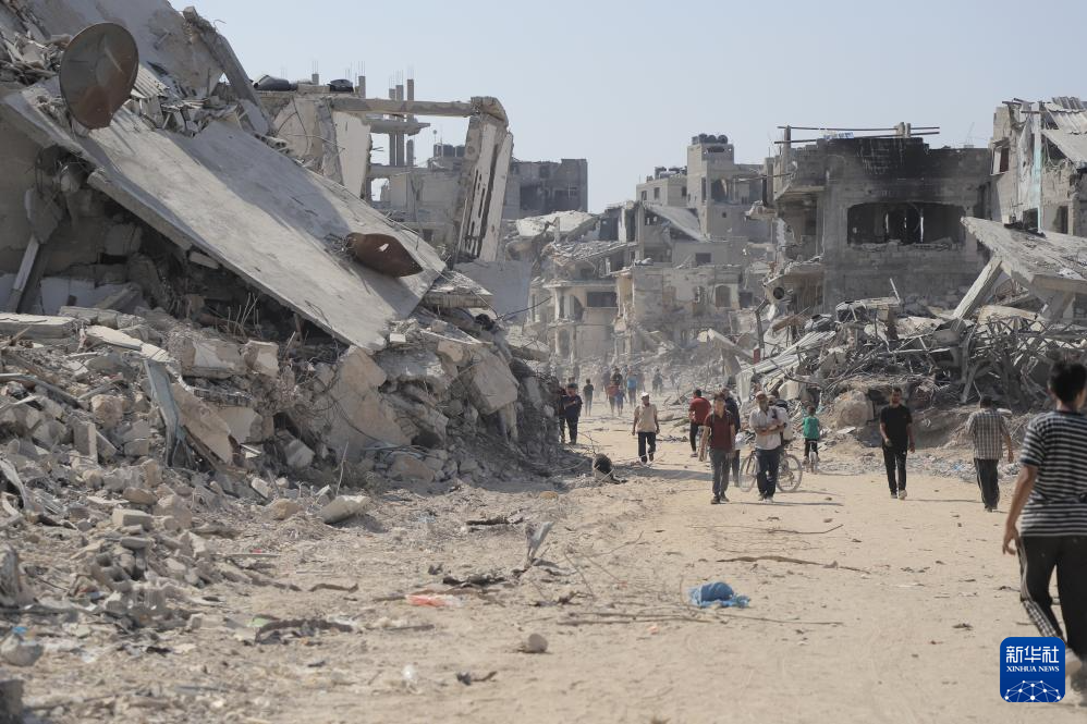 7月11日,在加沙城舒加艾耶社区,民众穿过废墟。新华社发(阿卜杜勒拉赫曼·萨拉马摄)