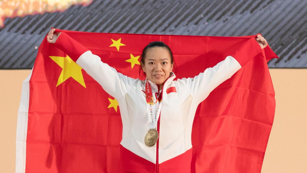 2022年12月6日,中国选手蒋惠花在颁奖仪式上。当日,在哥伦比亚波哥大举行的世界举重锦标赛女子49公斤级比赛中,蒋惠花以抓举93公斤、挺举113公斤、总成绩206公斤夺冠。新华社记者 王天聪 摄