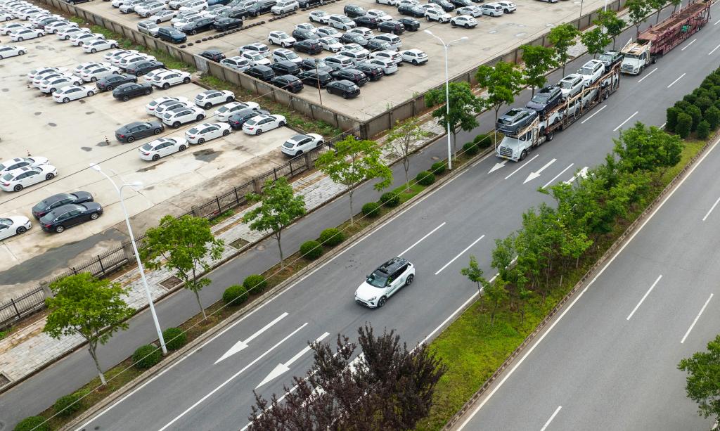 智能网联汽车测试员王娟乘坐无人驾驶汽车在路测中(7月4日摄,无人机照片)。