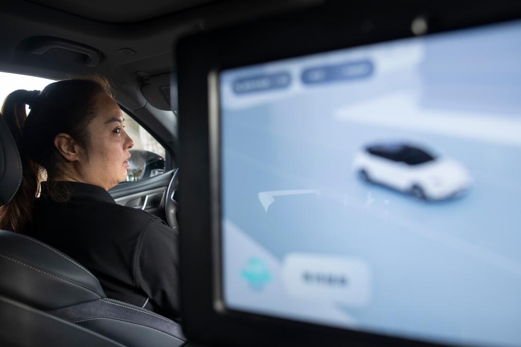 智能网联汽车测试员王娟在进行路测前调整后视镜(7月4日摄)。